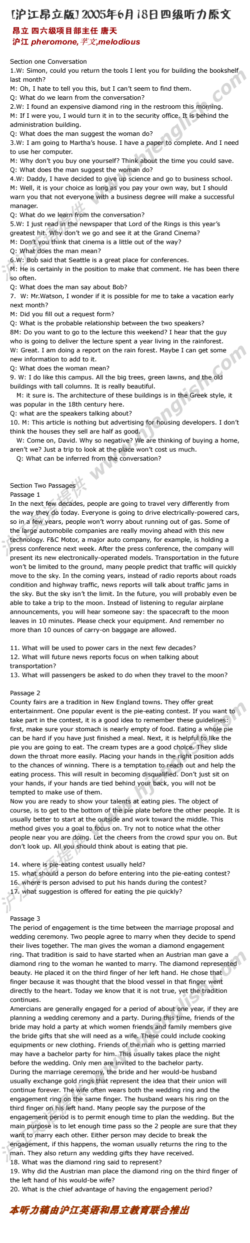 [沪江版]2005年6月18日四级听力原文