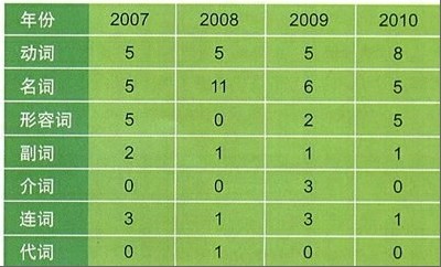 2010年高考英语江苏卷的完形填空部分回归了人物传记类文章。此类文章在感情基调上一般属于从消极悲观乌云密布转向积极乐观阳光明媚。但在20个空的设置方面,与前三年相比,动词、名词、形容词、副词四种实词的考查占了95%的比例,创历史新高(如下表所示)。