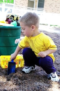 小男孩在石头的周围挖呀挖,成功地把它从泥沙中挖了出来。接着,他有点吃力把石头往沙箱上推。(他只是个小男孩,石头显得很大。)当他把石头推到沙箱的边缘是,却发现自己没办法把石头滚过沙箱那堵矮小的墙。