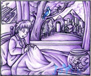 【1】One day, overnight, the world turned violet. Just about everything turned violet from the sky and ocean and mountains to the trees and animals and people and from the tallest skyscrapers to the tiniest ant. People sat around looking at one another wondering if they were dreaming. But nobody woke up and things stayed violet, all except for a single Blue Jay who hadn't changed color and stayed the brightest blue.
