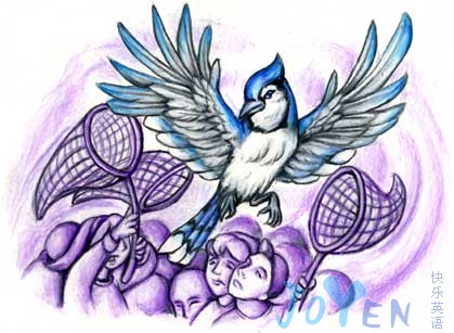 【6】 The first thing people asked was what about the Blue Jay. Had he stayed blue? Yes, he was still the same color. No longer were there two colors in the world, but just one -- the color blue. And because the Blue Jay was a color like everybody and everything else people began to lose interest. Now that he was neither more nor less important crowds stopped coming and one day, six months into the year that the world had turned blue, somebody let him out of his cage and he flew off looking happy to be free.