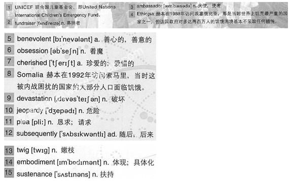 My mother got involved with UNICEF because her cousin was a part of organizing a big charity 2)fundraiser event. There was a concert, and she was asked to say a few words, and the Executive Director of UNICEF at the time, Jim Grant, was in the audience, and I guess he just watched her speaking up there and realized that she would make a wonderful 3)ambassador and offered her the job right there and then that night at a dollar a year.