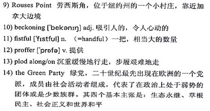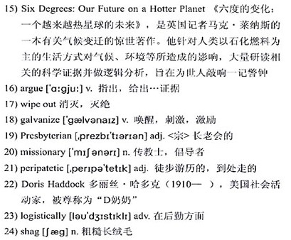 A longtime member of 14)the Green Party, she has been concerned for years about global warming. But after she retired last year, she joined an environmental group and read 15)Six Degrees: Our Future on a Hotter Planet by Mark Lynas. The book, which 16)argues that most of humanity could be 17)wiped out by the end of the century if Earth’s temperatures continue to warm, 18)galvanized her.