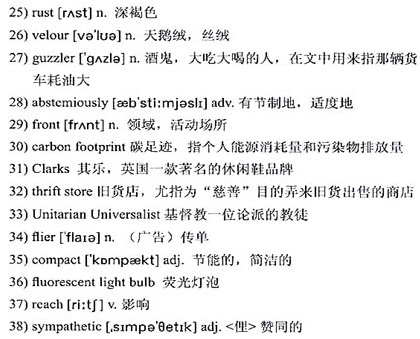 By living 28)abstemiously on other 29)fronts, she said she had managed to keep her 30)carbon footprint to half that of the average American. She never eats out and, except for her T-shirts, all her clothes are second-hand. Even her white 31)Clarks sneakers were bought from a 32)thrift store.