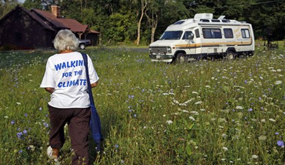 每逢星期天,她会去沿途的基督教一位论派的教堂。在那里,她把一些传单分发给大家,上面列出了人们可以通过哪些小举措来缓解全球变暖的状况,比如使用节能的荧光灯泡,游说学校开设有关环保的科目。