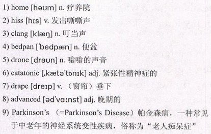 I have come 3,000 miles to be with her, but silence forms a wall between us now. 8)Advanced 9)Parkinson’s has already claimed her voice. Her legs, long withered,10)dangle uselessly. I wheel her into her small room, still 11)stupefied by the disease that chains us both to these white walls away from life.
