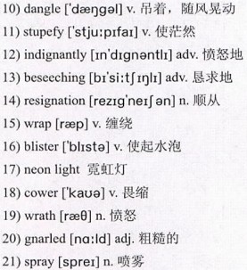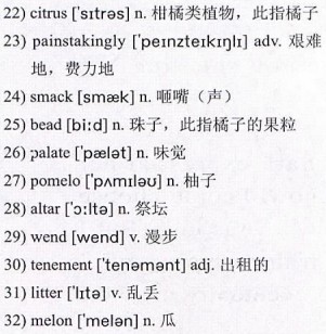 She points a 20)gnarled finger at the orange I left on her table. I peel it carefully, glad to have something to do. A 21)spray of 22)citrus fills the air and her eyes widen like a child anticipating sweets. I hand her a slice, which she grasps unsteadily. She brings it 23)painstakingly to her mouth and sucks with soft 24)smacks. I eat my slice too, squeezing the little 25)beads of juice with my teeth until the flavor bursts over my tongue like a rain shower.