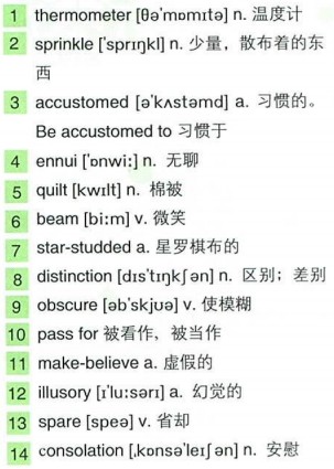 The 1)thermometer had dropped to 18 degrees below zero, but we still chose to sleep in the porch as usual. In the evening, the most familiar sight to me would be stars in the sky. Though they were a mere 2)sprinkle of twinkling dots, yet I had become so 3)accustomed to them that their occasional absence would bring me loneliness and 4)ennui.