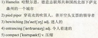 When the people of 1)Hamelin, Germany had a problem with rats, they called the 2)Pied Piper. With his 3)bewitching pipe and enchanting music, he lured the rats away from the city and into a watery grave. But when the people of Hamelin refused to pay the Pied Piper what they had promised, he turned his 4)entrancing music on their children, leading them away to never be seen again. This key moment in a familiar fairy tale carries many insights. It is, at once, a commentary on social values, a vivid example of family tragedy, and a bit of personal psychology. Folklore is 5)compacted wisdom-literature that yields more information with each reading.