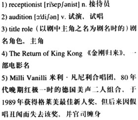 The newspaper I previously worked for employs a very friendly 1)receptionist. All receptionists are supposed to be friendly, but Connie Abbott has such a positive tone, she could brighten your day by saying, “Did anyone ever tell you that you look like a movie star? You ought to go to Hollywood and 2)audition for the 3)title role in a new movie: 4)The Return of King Kong.”