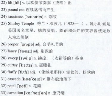 I could see why my mother was fascinated by the music. It was being 23)pounded out by a little Chinese girl, about nine years old. The girl had the 24)sauciness of a 25)Shirley Temple. She was proudly modest, like a 26)proper Chinese Child. And she also did a 27)fancy 28)sweep of a 29)curtsy, so that the 30)fluffy skirt of her white dress 31)cascaded to the floor like 32)petals of a large 33)carnation.