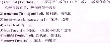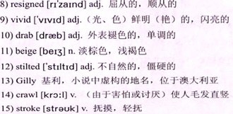 When Meggie came into the room 1)Cardinal Ralph hardly knew her. It was thirteen years since he had last seen her; she was fifty-three and he was seventy-one. Both of them had aged now. Her face hadn’t changed so much as settled, and into a mold unlike the one he had given her in his imagination. Substitute a 2)trenchant 3)incisiveness for sweetness, 4)a touch of 5)iron for softness; she resembled a vigorous, aging, 6)willful 7)martyr rather than the 8)resigned, contemplative saint of his dreams. Her beauty was as striking as ever, her eyes still that clear silvery grey, but both had hardened, and the once 9)vivid hair had faded to a 10)drab 11)beige. Most disconcerting of all, she wouldn’t look at him for long enough to satisfy his eager and loving curiosity. Unable to greet this Meggie naturally, he stiffly indicated a chair. “Please sit down.”