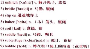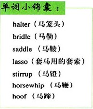 Tom 2)unhitched the 3)bridle and in its place 4)slipped on the rope 5)halter Smoky handed him. Then, one at a time, Smoky passed him the ends of two long ropes that were 6)coiled over his arm. Tom fastened one under the halter and the other to the horn of the 7)saddle.