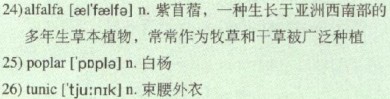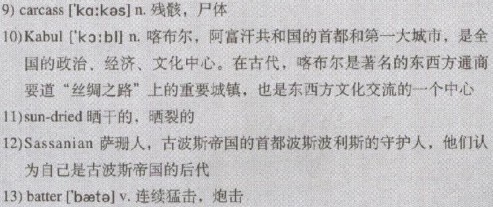 The Bamiyan Valley below was carpeted by lush farming fields. Babi said they were green winter wheat and 24)alfalfa, potatoes too. The fields were bordered by 25)poplars and crisscrossed by streams and irrigation ditches, on the banks of which tiny female figures squatted and washed clothes. It was autumn, and Laila could make out people in bright 26)tunics on the roofs of mud brick dwellings laying out the harvest to dry. The sky above all of this was an immaculate, spotless blue. “It’s so quiet,” Laila breathed. She could see tiny sheep and horses but couldn’t hear their 27)bleating and 28)whinnying. “It’s what I always remember about being up here,” Babi said. “The silence. The peace of it. I wanted you to experience it. But I also wanted you to see your country’s heritage, children, to learn of its rich past. You see, some things I can teach you. Some you learn from books. But there are things that, well, you just have to see and feel.”