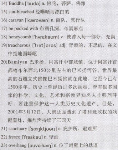 As they climbed, Babi told them that 20)Bamiyan had once been a thriving Buddhist center until it had fallen under Islamic Arab rule in the ninth century. The sandstone cliffs were home to Buddhist monks who carved caves in them to use as living quarters and as 21)sanctuary for weary traveling pilgrims. The monks, Babi said, painted beautiful 22)frescoes along the walls and roofs of their caves.