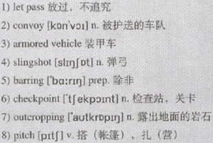 A jeep honked and Tariq whistled back, beaming and waving cheerfully. “Lovely guns!” he yelled. “Fabulous jeeps! Fabulous army! Too bad you’re losing to a bunch of peasants firing 4)slingshots!” The convoy passed. The driver merged back onto the road.