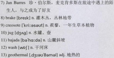 After McCandless bid farewell to 7)Jan Burres at the Salton City Post Office, he hiked into the desert and set up camp in a 8)brake of 9)creosote at the edge of Anza-Borrego Desert State Park. When he needed provisions, he would hitch or walk the four miles into town, where he bought rice and filled his plastic water 10)jug at the market-liquor store-post office. One Thursday in mid-January, McCandless was hitching back out to the 11)bajada after filling his jug when an old man, name of Ronald Franz, stopped to give him a ride.