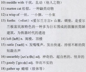 I am not certain that he distinguishes between the natural and supernatural very clearly. He told me the other day that foxes and cats like to be in the “13)forths” after nightfall; and he will certainly pass from some story about a fox to a story about a spirit with less change of voice than when he is going to speak about a marten cat—a rare beast nowadays. Many years ago he used to work in the garden, and once they put him to sleep in a garden-house where there was a 14)loft full of apples, and all night he could hear people 15)rattling plates and knives and forks over his head in the loft. Once, at any rate, he has seen an 16)unearthly sight in the woods. He says, “One time I was out cutting timber over in Inchy, and about eight o’clock one morning when I got there I saw a girl picking nuts, with her hair hanging down over her shoulders, brown hair, and she had a good, clean face, and she was tall and nothing on her head, and her dress no way 17)gaudy but simple, and when she felt me coming she 18)gathered herself up and was gone as if the earth had swallowed her up. And I followed her and looked for her, but I never could see her again from that day to this, never again.”