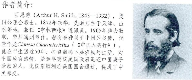 上个世纪之交的中国人究竟过着什么样的生活?经历着怎样的动乱和变化?保持着哪些文化传统和陈规陋习?都市、乡村及社会各层面的具体状况如何?Chinese Characteristics(《中国人德行》)一书将为你解答这些问题。本书首版于1899年,作者Arthur H. Smith系100多年前在中国居住并深谙中国文化的美国人。他在该书中分析了中国人的国民性,比如忍耐、坚韧、节俭、勤劳,也指出了中国国民存在的问题:要面子、守旧、好猜疑、缺乏时间观念与公共精神等等(其中所谈及的很多问题,现代人身上也都或多或少地保留着,需引起注意)。他以外国人独有的视角和眼光打量、考察着中国这块神秘的土地,并以生动形象的语言记录下他的观感和惊奇。他对中国社会的研究深为鲁迅、潘光旦等学人所称道。