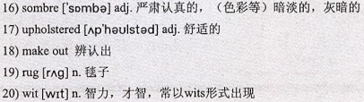 When I came to the house on Madison Avenue it looked so big and brown and 13)forbidding that I didn’t dare go in, so I walked around the block to get up my courage. But I needn’t have been a bit afraid; your 14)butler is such a nice, fatherly old man that he made me feel at home at once. “Is this Miss Abbott?” he said to me, and I said, “Yes,” so I didn’t have to ask for Mr. Smith after all. He told me to wait in the 15)drawing-room. It was a very 16)sombre, magnificent, man’s sort of room. I sat down on the edge of a big 17)upholstered chair and kept saying to myself: “I’m going to see Daddy-Long-Legs! I’m going to see Daddy-Long-Legs!”