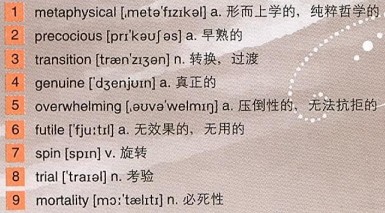 When I was 9 years old going on 10, I experienced a true 1)metaphysical crisis. Maybe this seems young for such a thing, but I was always a 2)precocious child. It all happened over the summer between 4th and 5th grade. I was going to be turning 10 years old in July and there was something about this 3)transition from 9 to 10, from single-digit to double-digit, that shocked me into a 4)genuine existential panic usually reserved for people turning 50. I remember that life was passing me by so fast. It seemed like only yesterday I was in kindergarten and here I was, about to turn 10. Soon I would be a teen-ager and then middle-aged and then elderly and then dead. And soon everybody else would be dead too. My parents would die, my friends would die, my cat would die.