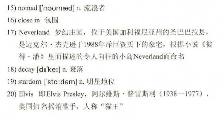 However, aside from the title of King of Pop, he also won a less welcome nickname— 9)Wacko Jacko. Everything he did came under a harsh spotlight, including his rapidly changing appearance. In 2003, Jackson was charged with seven counts of child sexual abuse and two counts of 10)administering an 11)intoxicating 12)agent in order to commit that 13)felony. Finally Jackson was cleared but became a virtual 14)recluse and a 15)nomad, traveling the world with his children. Creditors started to 16)close in on him, possessions were sold and 17)Neverland was left to 18)decay. He was left to rely largely on the support of wealthy friends attracted by his 19)stardom.
