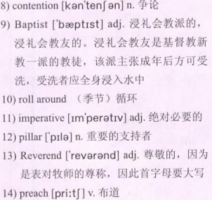 Each August, when blueberry season would 10)roll around, my mother would prepare me for Aunt Fannie’s visit. It was 11)imperative that I be on my best behavior. After all, the woman was old, wealthy, stern, and a 12)pillar of the church (I guess that would make her my “sainted” Aunt Fannie). 13)Reverend Nash had once 14)preached on the consequences of looking on 15)sinful things and had told about Lot’s wife being turned to a pillar of salt because she looked back on wicked 16)Sodom and 17)Gomorrah. I didn’t know what Aunt Fannie had looked at, but it must have been pretty bad. Whatever it was, it had left her hair a 18)decided shade of blue and turned her into a pillar of the church. Whenever she was at the house, I didn’t need to be reminded to guard my thoughts and 19)watch my tongue.