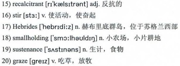 Our new host Elizabeth, a retired occupational therapist in her seventies, picked us up at the dock. Elizabeth calls her house and small plot of land by the water the Glebe House. In contrast to Radford Mill, Glebe House is a18)smallholding where most of the work is for19)sustenance rather than for commercial purposes. There is a one-acre walled garden and a flock of sheep that 20)graze by the sea.