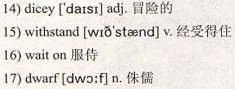Come to think of it though, I should have been prepared for the 14)dicey stuff; we all should have been prepared. The pretty and good young woman only marries the prince after she has proven her ability to 15)withstand pain, humiliation, and other sorts of character building exercise. I should have realized that to achieve the fairytale ending, the princesses had to overcome extreme obstacles, fire breathing dragons, the poison apples, scrubbing the floors on hands and knees, 16)waiting on others as if you were the house maid; the seven 17)dwarves each had their own “unique” personality. It was all there. Why didn’t I see it? Maybe I blocked it out, who knows.