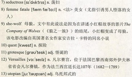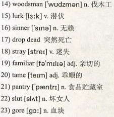 Not all of the Little Red Riding Hood versions are as19)familiar or as 20)tame. In an oral folktale, The Grandmother’s Tale, the wolf arrives at Grandmother’s house, kills her, and puts her flesh and blood in the 21)pantry. Upon arrival, the wolf tells the girl to eat the flesh and drink the wine (blood) in the pantry. And, as she eats, the cat says, “She is a 22)slut who eats the flesh and drinks the blood of her granny.” Despite the bloody 23)gore of this tale, the girl manages to escape from the wolf.