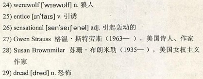 Orenstein features a quote by 28)Susan Brownmiler, who says: “Fairy tales are full of vague 29)dread, a 30)catastrophe that seems to befall only little girls...There are frightening male figures abroad in the woods—we call them wolves, among other names—and females are helpless before them.”