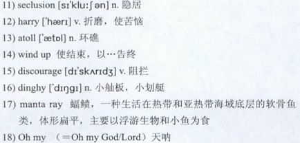 Part of the draw of living on the island was that “time did not matter—sometimes I would lose track of the year,” he said. “It was so magical, millions of birds, turtles. When I’d go out with the 16)dinghy, 17)manta ray would escort me, dolphins.” Still, island life took its toll. “I got attacked by loneliness,” said Mr. Lextrait, who came to depend on the company of his German shepherd mix. His infrequent visitors would ask things like “What are you going to do if a coconut falls on your head?”—given that the nearest doctor was hundreds of miles away. “I said, ‘18)Oh my, if I think like that, I’ll never do anything.’”