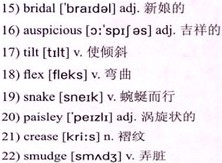 When the artist gets to me, she silently picks up one of my hands, turns it one way and then the other, takes a tube of henna, pauses, 17)tilts my wrist to the side again, and begins to work. I know, without being asked, to keep my palm 18)flexed and as still as possible. There’s no plan, no contemplation; the pen freely moves where it will. I watch, amazed as the curves begin to form shapes. Elaborate flowers blossom on my skin. Leaves19)snake across my wrist and settle on my forearm. Another artist, who has just finished with one of Nee’s cousins, settles down at my other side and starts working on my right hand. A 20)paisley pattern blooms through the 21)creases of my palm. When everything’s finished, I am warned against doing anything that might disturb or 22)smudge the henna. It will be hours before the color has properly soaked into the skin. My eyes widen. This mehndi business is much more serious than I had imagined.