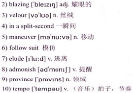 Kathleen Kores, her pumpkin-colored hair flowing over a 2)blazing red 3)velour blouse, moved along the floor of her studio in Glastonbury the way a snake moves in the grass, smoothly and silently. Then, in a 4)split-second 5)maneuver, she bent a knee and threw a hip to one side like a weapon.