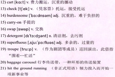 That was the last time I 13)checked a suitcase at the airport. In the following years, I realized that travel didn’t have to be so 14)burdensome. On my first trip to Europe, I took nothing more than a small 15)carry-on bag (16)swapping my wardrobe of clothes for a packet of laundry 17)detergent). I knew every ounce would weigh on me like a little anchor, so I was determined not to include a single item that was unnecessary or 18)superfluous. The experience was exhilarating—while others 19)trouped to the 20)baggage carousel, I 21)hit the ground running. I was mobile, flexible, and fancy free—and never once struggled to 22)maneuver my bag on buses, subways, or long 23)flights of stairs. Furthermore, my sightseeing schedule was unaffected by hotel check-in and check-out times; I could carry my little bag to museums and tourist sites, and 24)stash it in a 25)locker when need be.
