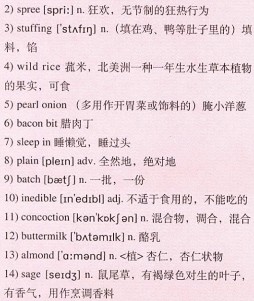 There are, of course, always the exceptions. My neighbor Sue refuses to make any stuffing at all because last Thanksgiving her fa-mily’s traditional “apple-13)almond-14)sage stuffing” recipe 15)fell under suspicion. It started when she found out that a 16)certain cousin named Heidi follows a traditional recipe for apple-17)walnut-sausage stuffing that was given to her by a 18)great-aunt who was known for her orange-walnut-19)fennel stuffing. I ask you, how do you 20)get to the bottom of that?
