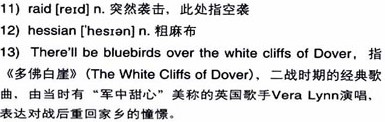 A Liverpool woman remembers how another little girl was made happy that year despite the war. “Christmas, 1941: The men were away except my elder brother, which [who] served in the First World War and was in the Home Guard. My daughter had asked Father Christmas for a doll’s house. We looked at each other in dismay. Then my brother found an old bird cage. During the 11)raids, he worked on it, found bits of cardboard for the walls. The office wastepaper basket provided an old file, which made the roof, and he painted the floors. We hunted for all kinds of bits and pieces and the miracle was achieved. A piece of 12)hessian dyed red, fringed, made an elegant carpet. Oh, never will I forget her face that dark Christmas morning and her childish voice piping ’13)There’ll be bluebirds over the white cliffs of Dover’ as she saw those tables and chairs, tiny pictures made out of cigarette cards, her cries of joy as she discovered each new thing.”
