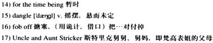 14)For the time being, however, I think they’ll go about it very gently, keeping me 15)dangling and 16)fobbing me off with fair words until 17)Uncle and Aunt Stricker’s big 18)silver wedding celebration in December is over. I fear they will be taking measures to get rid of me.