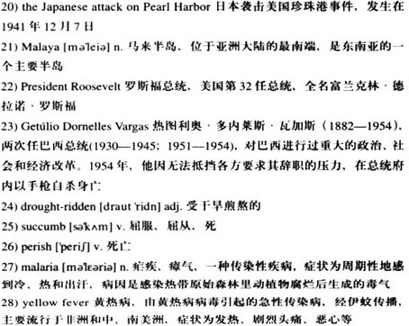 According to Brazilian government records, more than 55,000 people, almost all of them from the 24)drought-ridden and poverty-stricken northeast, were sent to the Amazon to harvest rubber for the war effort. There are no official figures on how many of them 25)succumbed to disease or animal attacks, but historians estimate that nearly half 26)perished before Japan surrendered in September 1945.