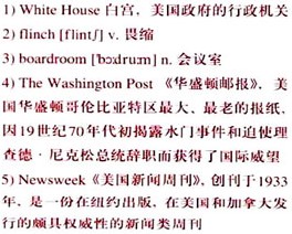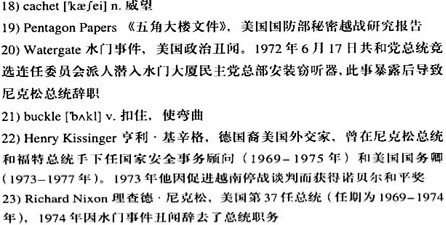 Though by her own description “painfully shy,”Graham would grow to enjoy the social 18)cachet that her new role entailed. Her greatest triumph was the stamp she put on the Post, especially during the 19)Pentagon Papers episode in 1971 and the Post’s groundbreaking 20)Watergate investigation a couple of years later. Despite enormous pressure from the White House in both cases, Graham never 21)buckled under, spurring her staff to pursue both stories vigorously. Even so, she never forgot her social graces. “she’d call and say, ‘How about a movie?’”recalls 22)Henry Kissinger, Secretary of State under 23)Richard Nixon.