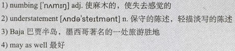 I decided to go to Mexico and see if I could renew my perspective and outlook on life. To say I arrived in Mexico with a heavy heart is an 2)understatement. I booked a hotel on the 3)Baja choosing one of the less populated areas for tourists.