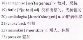 Morning calls to Red-beard and Geoff, but I have 18)antagonised him, I see. There is something so 19)futile about him, and I couldn’t bear the snobbish reluctance he showed to get into touch with the 20)cardiologist who unfortunately happens to be a lord. Yet to some extent we depend on him, and I try to 21)choke back my horror that this little 22)mannikin should be relevant to the health and safety of my darling Ralph. I 23)pressed on, screaming silently from every 24)cranny of my brain, until I got him to arrange for the lordly cardiologist to come tomorrow. Geoff seemed to take things more seriously when I described Ralph’s breathing. It seems that he took tow sleeping pills while I dozed last night, one seeming insufficient, and Geoff thought this might have affected his breathing. He has recommended a new sort for tonight. I dashed in to Hungerford to get them. Not availabe. I have ordered them to be brought out by taxi from 25)Newbury, and we have got them now.