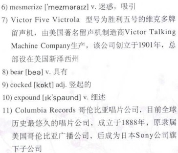When he was a little boy he had made weekly trips with his mother to a local department store. He was 6)mesmerized by the window displays and eagerly stood with his nose pressed against the glass until his breath clouded his view. Then came the display which would change his and many other lives 30 years later. It was a 7)Victor Five Victrola, the kind that needed to be wound by hand before placing the needle on the record, the machine which 8)bore the symbol of a black and white dog, ear 9)cocked to its side. Not missing a beat, he 10)expounded on a history lesson about 11)Columbia Records and their music machines, information 12)gleaned from his trips to the library. There was nothing he didn’t know about that golden age of music.