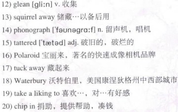 His mother died, and he eventually was able to live independently, supervised by an agency. It was through the agency that he obtained work, cleaning toilets of public facilities five nights a week. Every week he 13)squirreled away his paycheck, never forgetting the Victrola. He was on a mission to find and buy a 14)phonograph like the one he had once admired through plate glass.