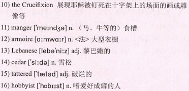 The tops of the mountains each had a gold cross; one was of 10)the Crucifixion. One of the station houses had a 11)manger and Christmas scene behind it. Oddly there was a building with a sign on it that said, “Orphanage”. Scanning the room’s magnificent furnishings I noticed a beautiful 12)armoire, elegantly hand carved from giant 13)Lebanese 14)cedar with glass doors. Something that puzzled me was the two or three pairs of shirts and pants hanging in it on display. 15)Tattered shirts and pants that were a boy’s size. Small shoes too, stuffed with paper and cardboard. The holes were obvious.