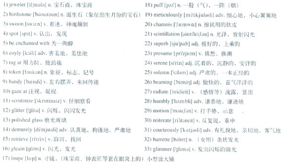 I stood at the jewelry counter carefully 11)scrutinizing the 12)glittering stones and creative settings in the brilliantly 13)polished glass case. When I pointed to the setting my daughter had admired, the dark-haired, dark-eyed jeweler smiled 14)demurely, opened the case and 15)retrieved the ring. He held the beautiful 16)gleaming ring up in the air, eyeing it from a distance. Then he examined the stone closely with his 17)loupe. Next, strangely enough, he blew a little 18)puff of air on it, as though it were dusty. His final act of preparing the piece of jewelry for my inspection was to 19)meticulously shine it with the 20)chamois cloth he carried in his back pocket. Finally pleased with the ring, he smiled, handed it to me and explained, “The 21)scintillation of this ring is 22)superb!”