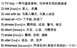 感恩节那天,我们家所有的亲戚欢聚一堂,或围坐在长桌旁边,或者坐在高脚桌前看电视。电视机开着,一些人边看电视边聊天。忽然,电视里的一幕吸引了他们的注意力,只听见一个大人说:“快听听这!”另一个人则回答道:“了不起哟!”(注:这里的listen at it和if that don誸 beat all是两个不合语法的句子,是作者有意记录的方言土语。)