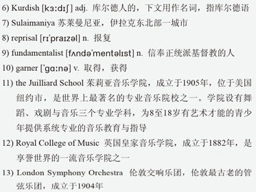Her efforts 5)culminated in an intensive two-week summer camp in the 6)Kurdish city of 7)Sulaimaniya last August, with a concert that allowed the Iraqi teenagers to demonstrate their talents in a war-torn country where classical musicians live in constant fear of 8)reprisals from Islamic 9)fundamentalists. “There are so many exciting things I would like to do with the orchestra,” she says. “These young people who have gone through so much with the war are coming together through music. I want to keep that going.”
