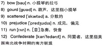 Dad had a knack for getting people in the mood for his music. Knowing of the 9)scattered 10)prejudice against the fiddle, he eased into a song titled Gloryland. It was a church song with church tones, but it was fairly fast with some good 11)runs. He shifted from Gloryland to The Bonnie Blue Flag, a 12)Confederate war song, which created a big stir—foot stamping, hand clapping and a few rebel yells.