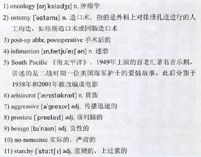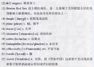 A week later I was 21)bundled into an ambulance and packed off to Mount Sinai, where the days passed in a “22)Matrix”-style blur. I remember the nurses calling, “Keys!!!” and the big fist of keys zipping and zooming up and down the hall floor…the old man with a thick 23)Yiddish accent chanting, “Noice(编者注:noice实为“nice”,带有犹太口音的人发“nice”一词听起来与“noice”相似), noice, noice!” …the nurses wrapping my arms, sore and 24)swollen from all the 25)IV needles, in hot towels.